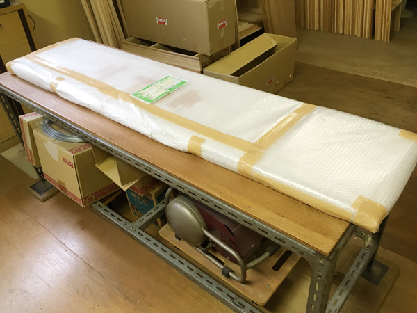 完成した捨て看板は紙など巻いてから紐で固定してエアーパッキンで包んでおります。